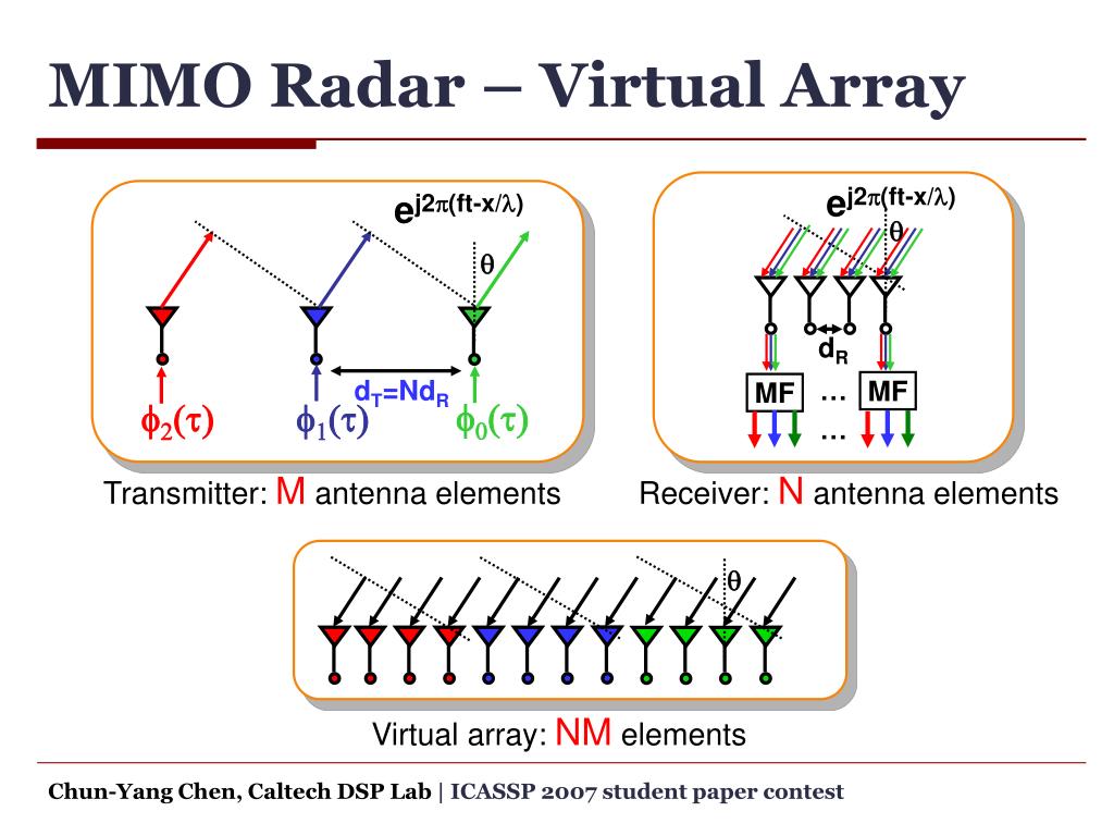 The radar systems which emits orthogonal (or noncoherent) waveforms in each transmitting antennas are called MIMO radar. MIMO Radar MIMO radar SIMO radar (Traditional) w2f(t) f2(t) w1f(t) f1(t) w0f(t) f0(t) Chun-Yang Chen, Caltech DSP Lab | ICASSP 2007 student paper contest