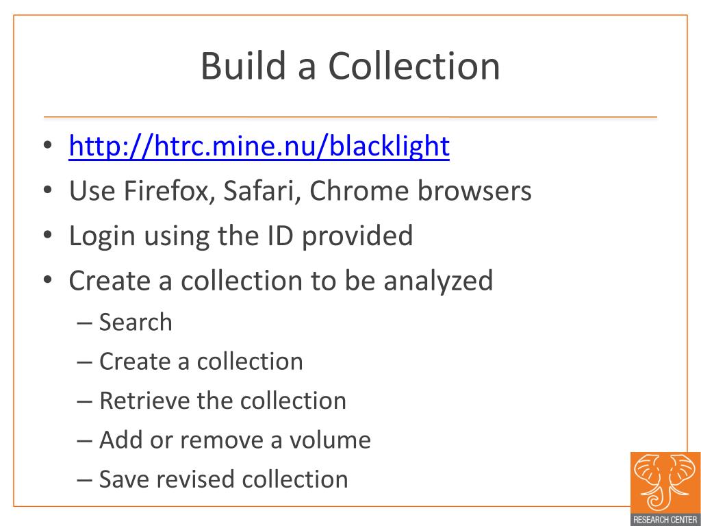Build a Collection • http://htrc.mine.nu/blacklight • Use Firefox, Safari, Chrome browsers • Login using the ID provided • Create a collection to be analyzed • Search • Create a collection • Retrieve the collection • Add or remove a volume • Save revised collection