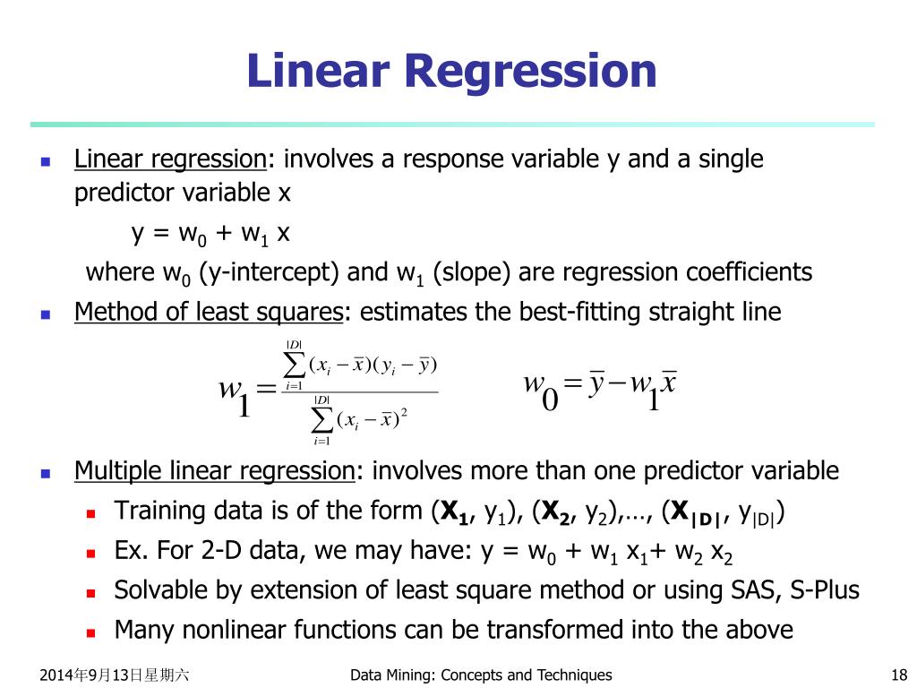Linear Regression • Linear regression: involves a response variable y and a single predictor variable x y = w0 + w1 x where w0 (y-intercept) and w1 (slope) are regression coefficients • Method of least squares: estimates the best-fitting straight line • Multiple linear regression: involves more than one predictor variable • Training data is of the form (X1, y1), (X2, y2),…, (X|D|, y|D|) • Ex. For 2-D data, we may have: y = w0 + w1 x1+ w2 x2 • Solvable by extension of least square method or using SAS, S-Plus • Many nonlinear functions can be transformed into the above Data Mining: Concepts and Techniques