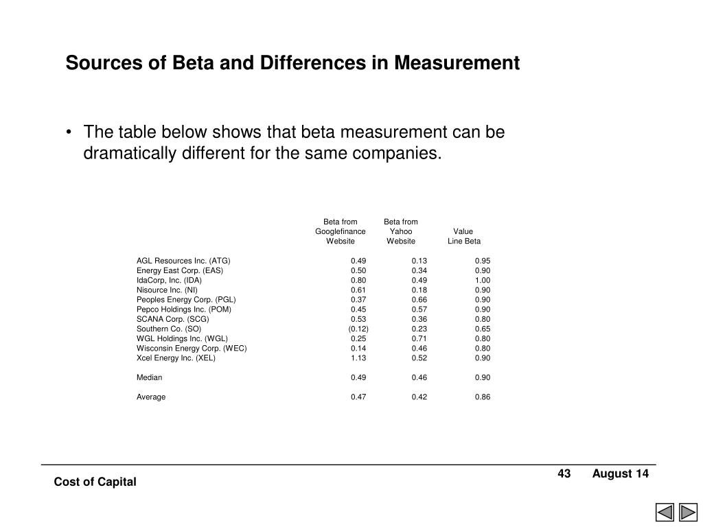 Sources of Beta and Differences in Measurement • The table below shows that beta measurement can be dramatically different for the same companies.