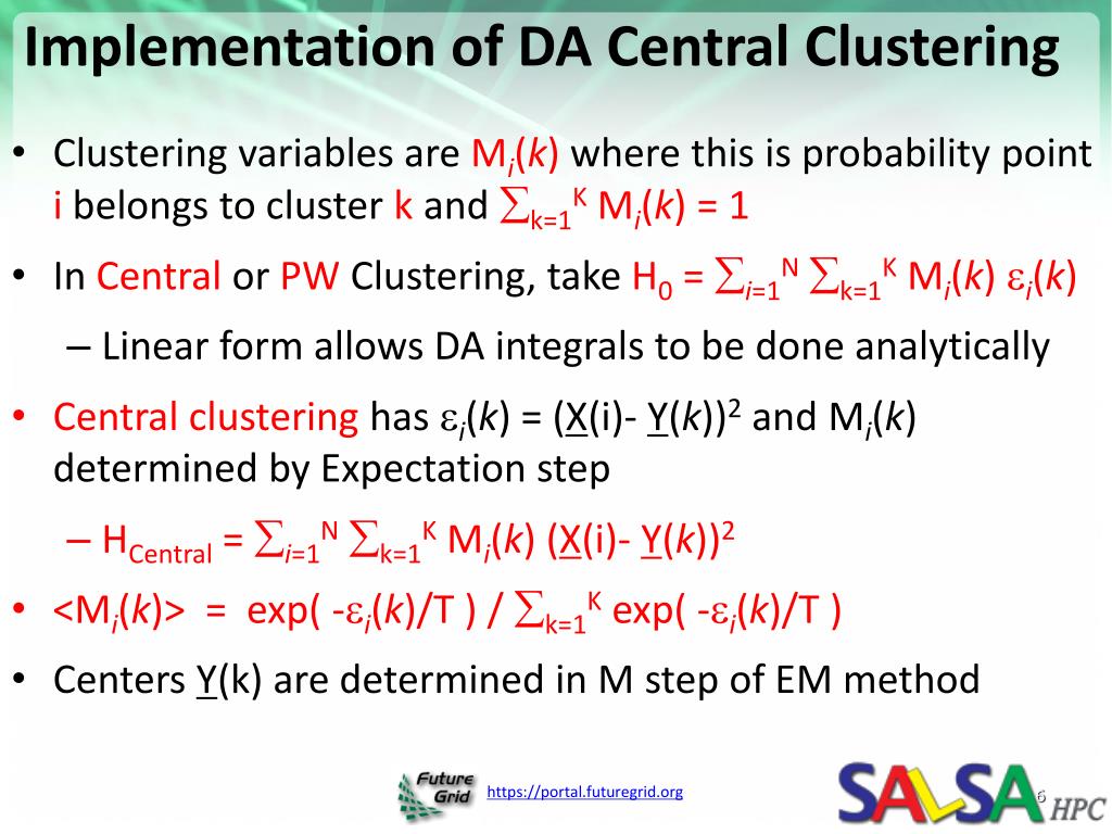 Implementation of DA Central Clustering • Clustering variables are Mi(k) where this is probability point ibelongs to cluster k andk=1KMi(k) = 1 • In Central or PW Clustering, take H0 = i=1Nk=1K Mi(k) i(k) • Linear form allows DA integrals to be done analytically • Central clustering hasi(k) = (X(i)- Y(k))2 and Mi(k) determined by Expectation step • HCentral = i=1Nk=1KMi(k) (X(i)- Y(k))2 • <Mi(k)> = exp( -i(k)/T ) / k=1Kexp( -i(k)/T ) • Centers Y(k) are determined in M step of EM method