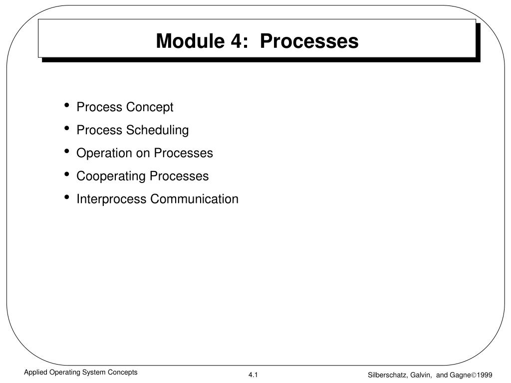Module 4: Processes • Process Concept • Process Scheduling • Operation on Processes • Cooperating Processes • Interprocess Communication Applied Operating System Concepts