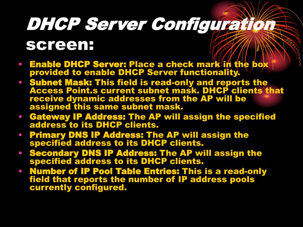 DHCP Server Configuration screen: • Enable DHCP Server: Place a check mark in the box provided to enable DHCP Server functionality. • Subnet Mask: This field is read-only and reports the Access Point.s current subnet mask. DHCP clients that receive dynamic addresses from the AP will be assigned this same subnet mask. • Gateway IP Address: The AP will assign the specified address to its DHCP clients. • Primary DNS IP Address: The AP will assign the specified address to its DHCP clients. • Secondary DNS IP Address: The AP will assign the specified address to its DHCP clients. • Number of IP Pool Table Entries: This is a read-only field that reports the number of IP address pools currently configured.