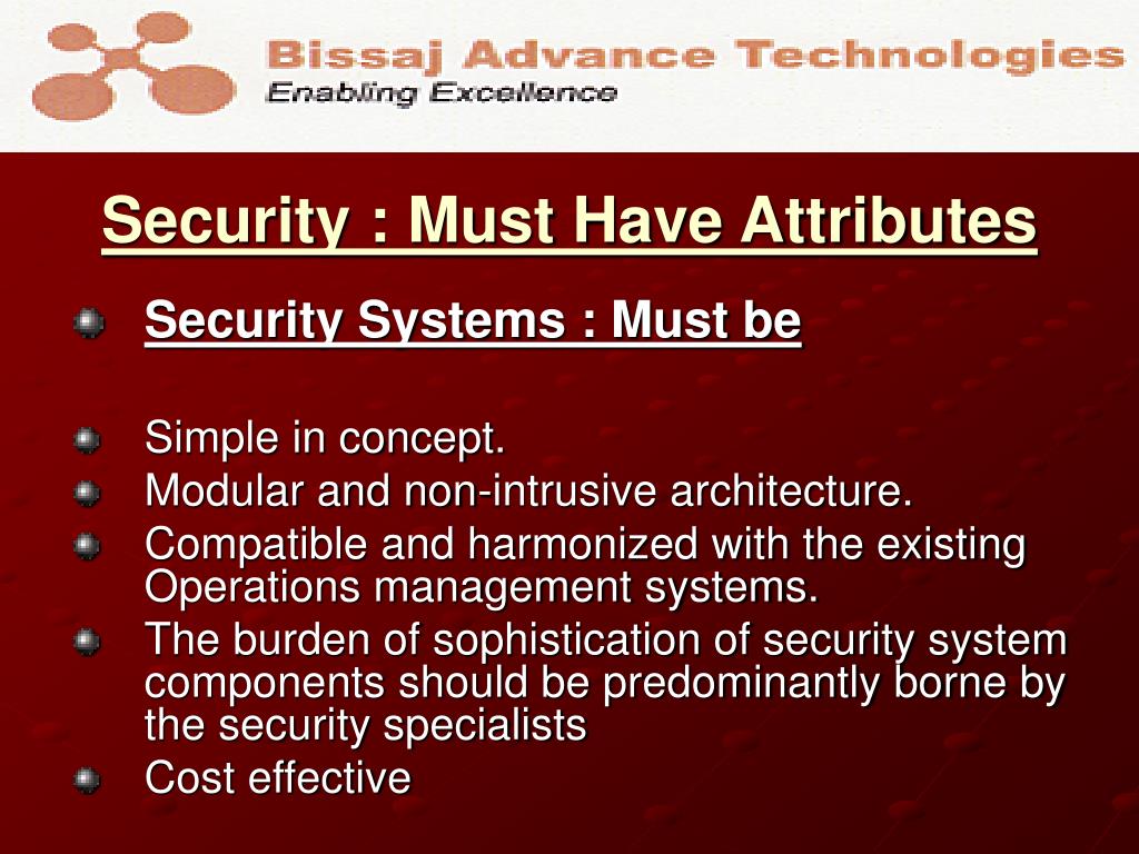 Security : Must Have Attributes • Security Systems : Must be • Simple in concept. • Modular and non-intrusive architecture. • Compatible and harmonized with the existing Operations management systems. • The burden of sophistication of security system components should be predominantly borne by the security specialists • Cost effective
