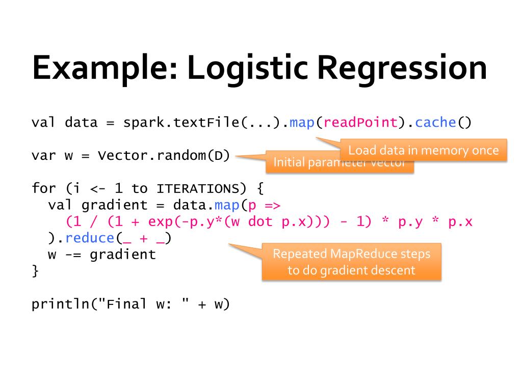 Example: Logistic Regression val data = spark.textFile(...).map(readPoint).cache() varw = Vector.random(D) for (i <- 1 to ITERATIONS) { val gradient = data.map(p => (1 / (1 + exp(-p.y*(w dot p.x))) - 1) * p.y * p.x ).reduce(_ + _) w -= gradient } println("Finalw: " + w) Load data in memory once Initial parameter vector Repeated MapReduce stepsto do gradient descent