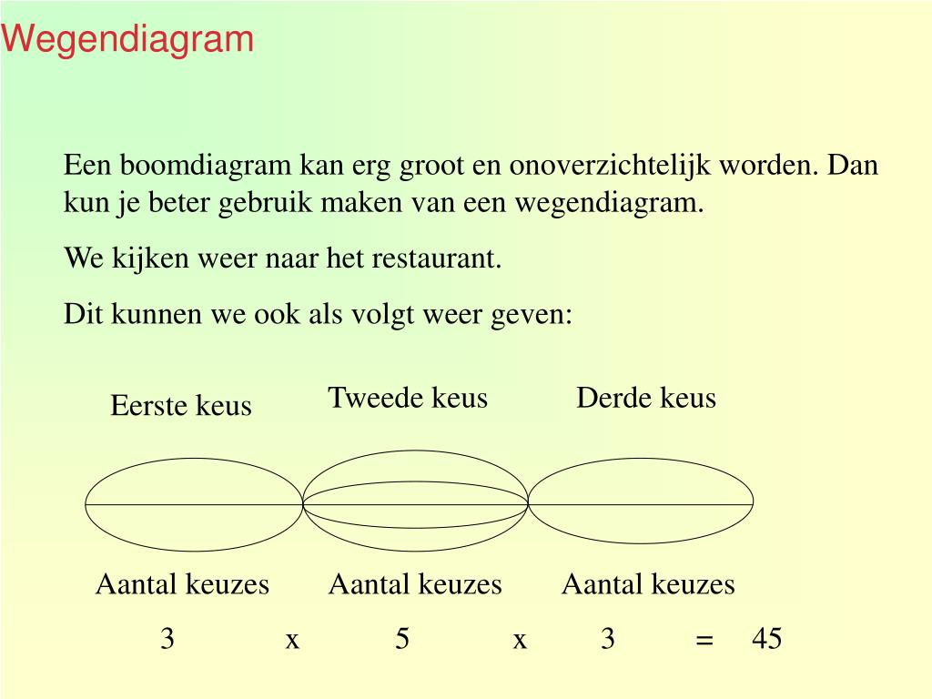 Wegendiagram Een boomdiagram kan erg groot en onoverzichtelijk worden. Dan kun je beter gebruik maken van een wegendiagram. We kijken weer naar het restaurant. Dit kunnen we ook als volgt weer geven: Tweede keus Derde keus Eerste keus Aantal keuzes Aantal keuzes Aantal keuzes 3 x 5 x 3 = 45