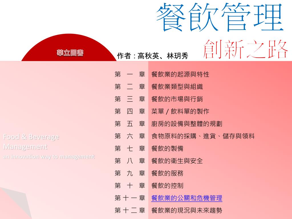 華立圖書 餐飲管理 創新之路 Food & Beverage Management An Innovation Way to Management 作者 : 高秋英、林玥秀 Copy Right @ 2012 餐旅觀光叢書 5662