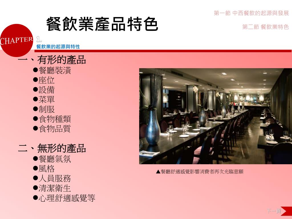 第一節 中西餐飲的起源與發展 餐飲業產品特色 第二節 餐飲業特色 • 一、有形的產品 • 餐廳裝潢 • 座位 • 設備 • 菜單 • 制服 • 食物種類 • 食物品質 • 二、無形的產品 • 餐廳氣氛 • 風格 • 人員服務 • 清潔衛生 • 心理舒適感覺等 1. CHAPTER 餐飲業的起源與特性 ▲餐廳舒適感覺影響消費者再次光臨意願 下一頁