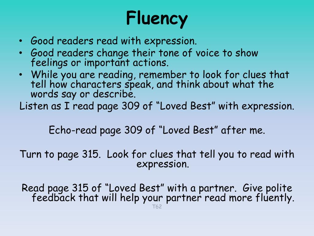 Fluency • Good readers read with expression. • Good readers change their tone of voice to show feelings or important actions. • While you are reading, remember to look for clues that tell how characters speak, and think about what the words say or describe. Listen as I read page 309 of “Loved Best” with expression. Echo-read page 309 of “Loved Best” after me. Turn to page 315. Look for clues that tell you to read with expression. Read page 315 of “Loved Best” with a partner. Give polite feedback that will help your partner read more fluently. T62