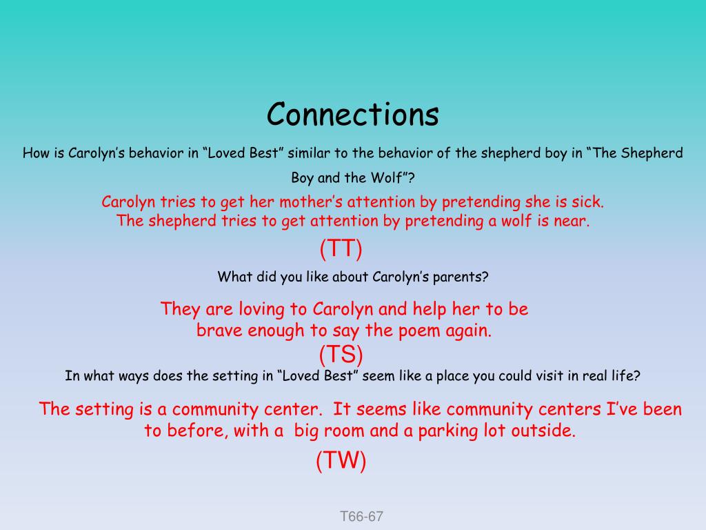 ConnectionsHow is Carolyn’s behavior in “Loved Best” similar to the behavior of the shepherd boy in “The Shepherd Boy and the Wolf”?What did you like about Carolyn’s parents? In what ways does the setting in “Loved Best” seem like a place you could visit in real life? Carolyn tries to get her mother’s attention by pretending she is sick. The shepherd tries to get attention by pretending a wolf is near. (TT) They are loving to Carolyn and help her to be brave enough to say the poem again. (TS) The setting is a community center. It seems like community centers I’ve been to before, with a big room and a parking lot outside. (TW) T66-67