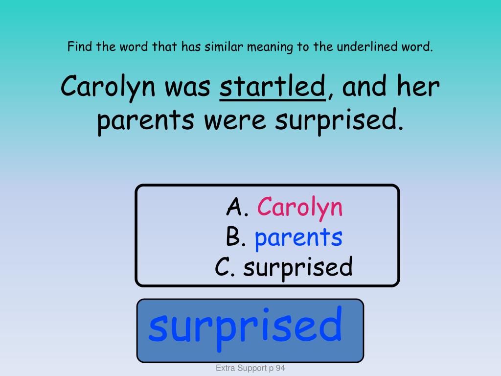 surprised Find the word that has similar meaning to the underlined word.Carolyn was startled, and her parents were surprised. A. Carolyn B. parents C. surprised Extra Support p 94