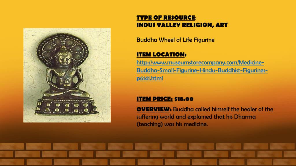 TYPE OF RESOURCE: INDUS VALLEY RELIGION, ART Buddha Wheel of Life Figurine ITEM LOCATION: http://www.museumstorecompany.com/Medicine-Buddha-Small-Figurine-Hindu-Buddhist-Figurines-p6141.html ITEM PRICE:$18.00 OVERVIEW: Buddha called himself the healer of the suffering world and explained that his Dharma (teaching) was his medicine.