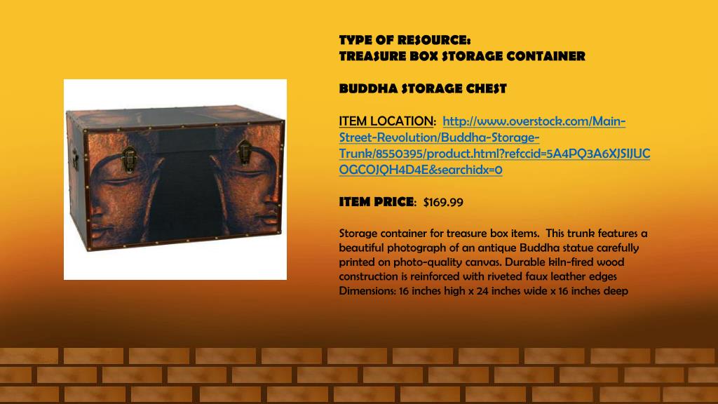 TYPE OF RESOURCE: TREASURE BOX STORAGE CONTAINER BUDDHA STORAGE CHEST ITEM LOCATION: http://www.overstock.com/Main-Street-Revolution/Buddha-Storage-Trunk/8550395/product.html?refccid=5A4PQ3A6XJSIJUCOGCOJQH4D4E&searchidx=0 ITEM PRICE: $169.99 Storage container for treasure box items. This trunk features a beautiful photograph of an antique Buddha statue carefully printed on photo-quality canvas. Durable kiln-fired wood construction is reinforced with riveted faux leather edges Dimensions: 16 inches high x 24 inches wide x 16 inches deep