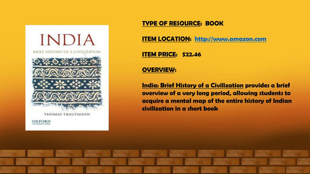 TYPE OF RESOURCE: BOOK ITEM LOCATION:http://www.amazon.com ITEM PRICE: $22.46 OVERVIEW: India: Brief History of a Civilization provides a brief overview of a very long period, allowing students to acquire a mental map of the entire history of Indian civilization in a short book