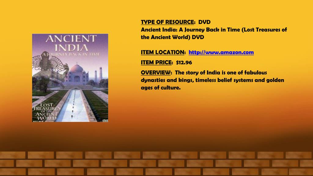 TYPE OF RESOURCE: DVD Ancient India: A Journey Back in Time (Lost Treasures of the Ancient World) DVD ITEM LOCATION:http://www.amazon.com ITEM PRICE: $12.96 OVERVIEW: The story of India is one of fabulous dynasties and kings, timeless belief systems and golden ages of culture.