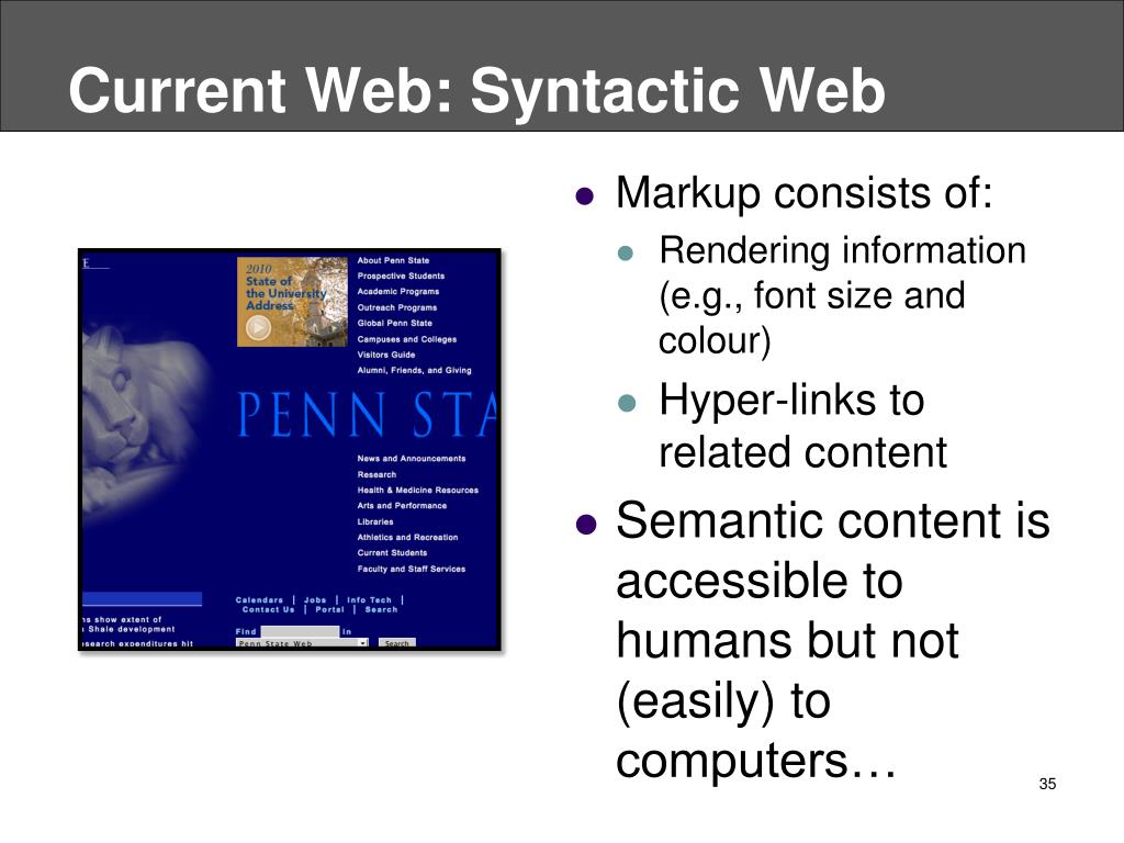 Current Web: Syntactic Web • Markup consists of: • Rendering information (e.g., font size and colour) • Hyper-links to related content • Semantic content is accessible to humans but not (easily) to computers…