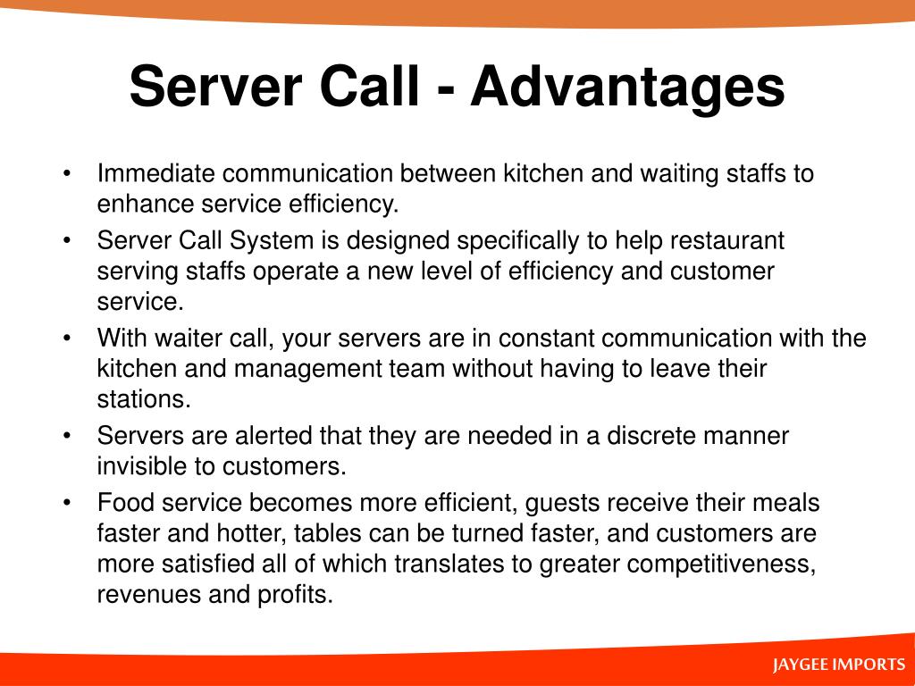 Server Call - Advantages • Immediate communication between kitchen and waiting staffs to enhance service efficiency. • Server Call System is designed specifically to help restaurant serving staffs operate a new level of efficiency and customer service. • With waiter call, your servers are in constant communication with the kitchen and management team without having to leave their stations. • Servers are alerted that they are needed in a discrete manner invisible to customers. • Food service becomes more efficient, guests receive their meals faster and hotter, tables can be turned faster, and customers are more satisfied all of which translates to greater competitiveness, revenues and profits.