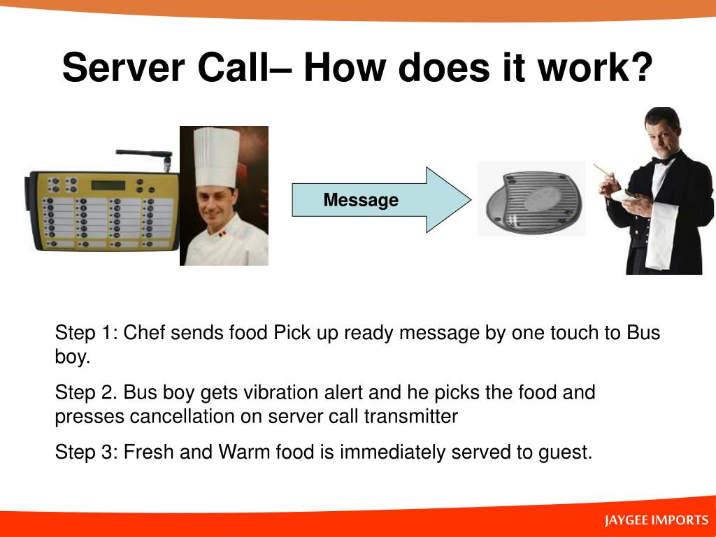 Server Call– How does it work? Message Step 1: Chef sends food Pick up ready message by one touch to Bus boy. Step 2. Bus boy gets vibration alert and he picks the food and presses cancellation on server call transmitter Step 3: Fresh and Warm food is immediately served to guest.