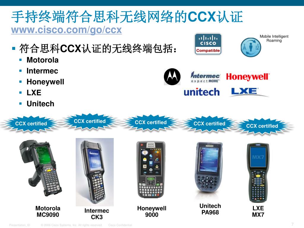 手持终端符合思科无线网络的CCX认证www.cisco.com/go/ccx手持终端符合思科无线网络的CCX认证www.cisco.com/go/ccx Mobile IntelligentRoaming • 符合思科CCX认证的无线终端包括: • Motorola • Intermec • Honeywell • LXE • Unitech CCX certified CCX certified CCX certified CCX certified CCX certified Unitech PA968 Motorola MC9090 Honeywell 9000 LXE MX7 Intermec CK3