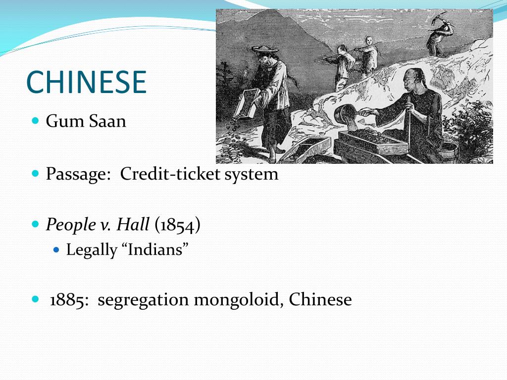 CHINESE • Gum Saan • Passage: Credit-ticket system • People v. Hall (1854) • Legally “Indians” • 1885: segregation mongoloid, Chinese