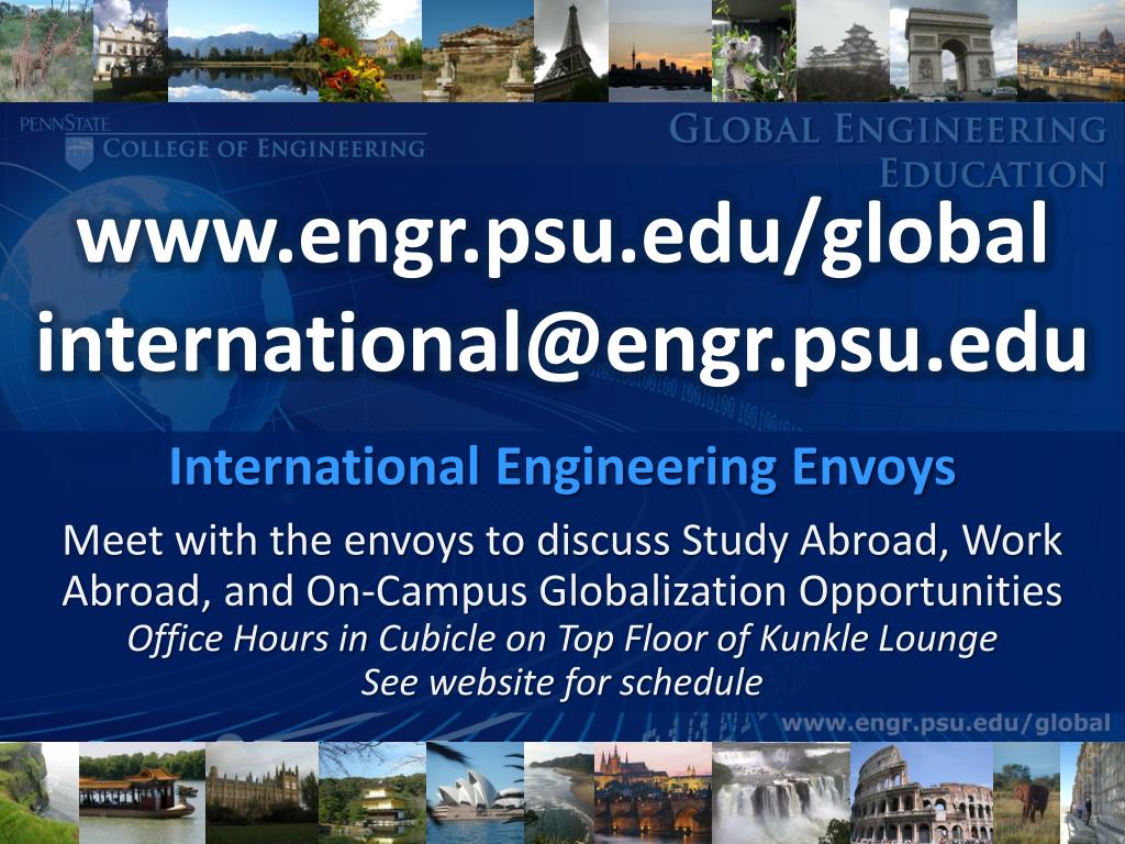 www.engr.psu.edu/globalinternational@engr.psu.edu International Engineering Envoys Meet with the envoys to discuss Study Abroad, Work Abroad, and On-Campus Globalization Opportunities Office Hours in Cubicle on Top Floor of Kunkle Lounge See website for schedule
