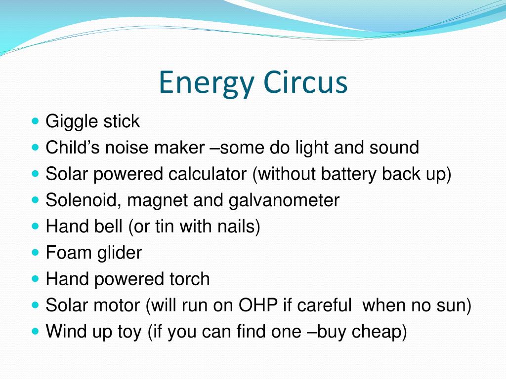 Energy Circus • Giggle stick • Child’s noise maker –some do light and sound • Solar powered calculator (without battery back up) • Solenoid, magnet and galvanometer • Hand bell (or tin with nails) • Foam glider • Hand powered torch • Solar motor (will run on OHP if careful when no sun) • Wind up toy (if you can find one –buy cheap)