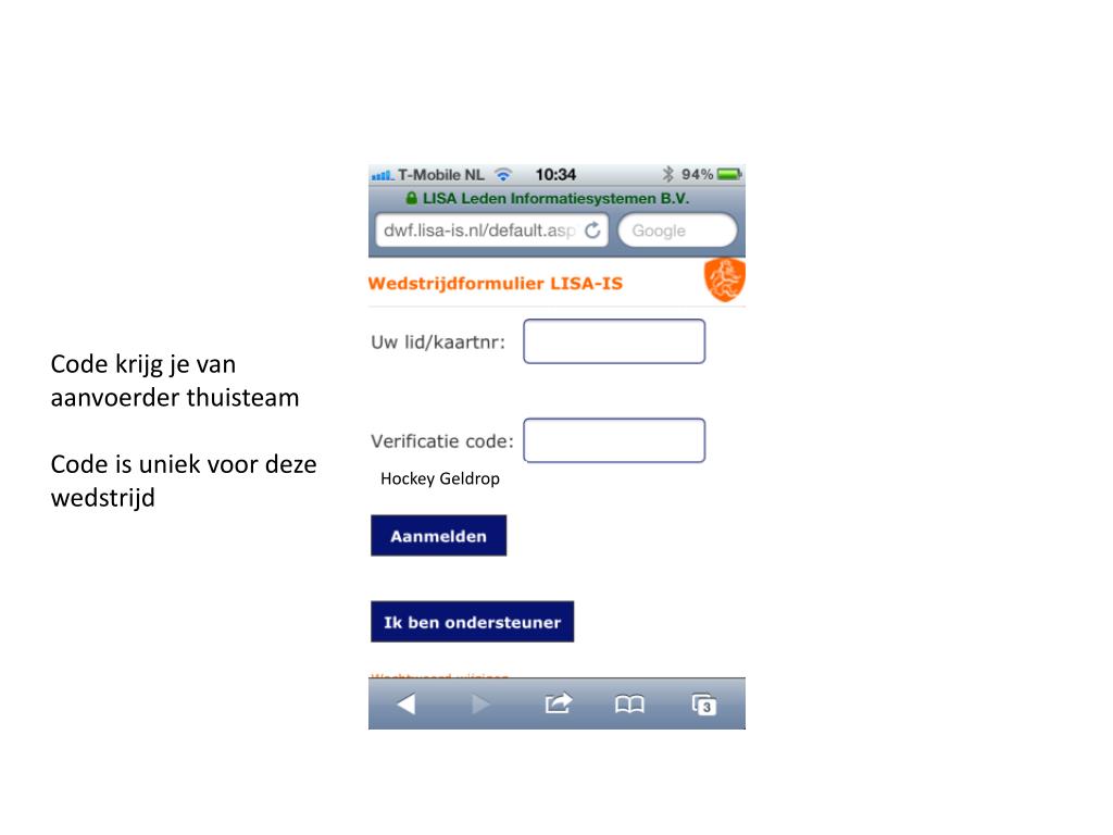 Code krijg je van aanvoerder thuisteam Code is uniek voor deze wedstrijd Hockey Geldrop