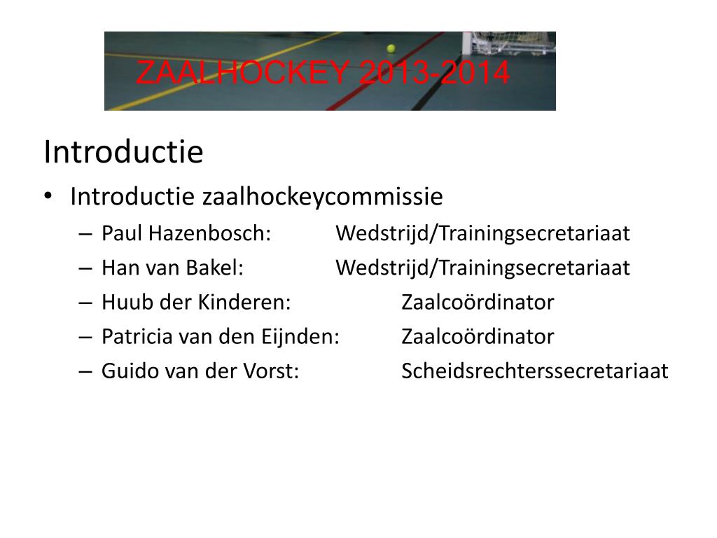 ZAALHOCKEY 2013-2014 Introductie • Introductie zaalhockeycommissie • Paul Hazenbosch: Wedstrijd/Trainingsecretariaat • Han van Bakel: Wedstrijd/Trainingsecretariaat • Huub der Kinderen: Zaalcoördinator • Patricia van den Eijnden: Zaalcoördinator • Guido van der Vorst: Scheidsrechterssecretariaat
