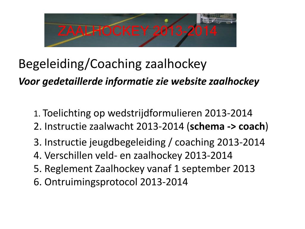 ZAALHOCKEY 2013-2014 Begeleiding/Coaching zaalhockey Voor gedetaillerde informatie zie website zaalhockey 1. Toelichting op wedstrijdformulieren 2013-2014 2. Instructie zaalwacht 2013-2014 (schema -> coach) 3. Instructie jeugdbegeleiding / coaching 2013-2014 4. Verschillen veld- en zaalhockey 2013-2014 5. Reglement Zaalhockey vanaf 1 september 2013 6. Ontruimingsprotocol 2013-2014
