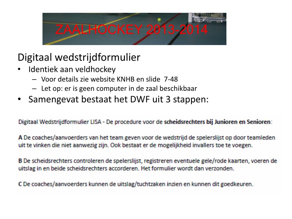 ZAALHOCKEY 2013-2014 Digitaal wedstrijdformulier • Identiek aan veldhockey • Voor details zie website KNHB en slide 7-48 • Let op: er is geen computer in de zaal beschikbaar • Samengevat bestaat het DWF uit 3 stappen: