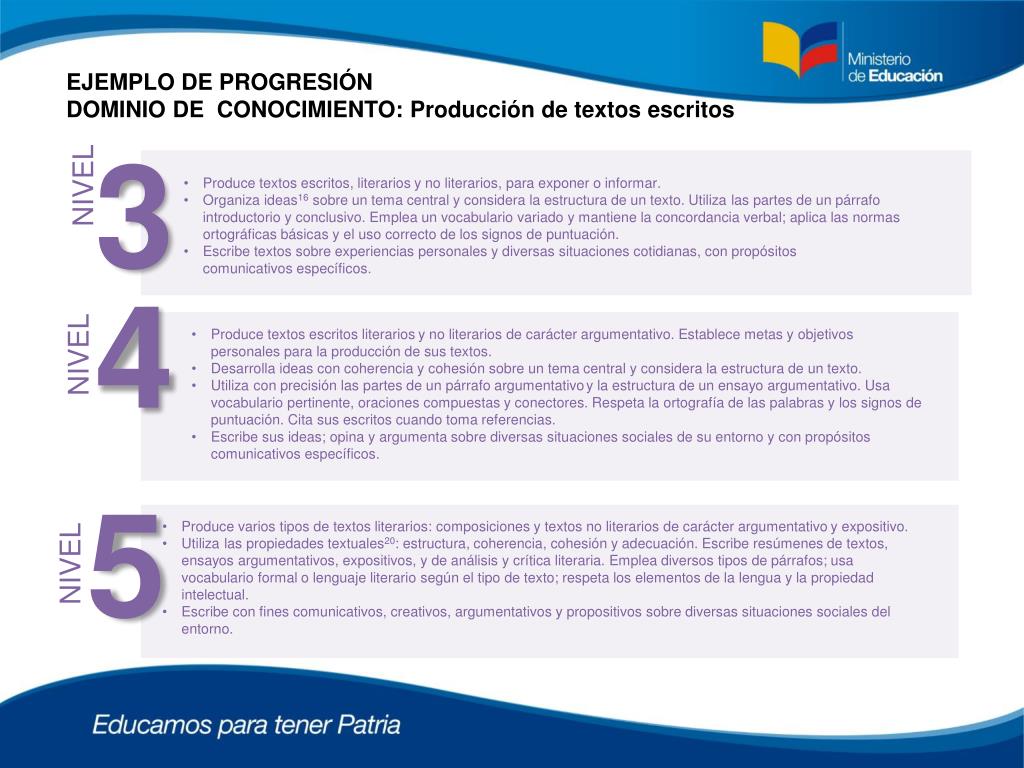 EJEMPLO DE PROGRESIÓN DOMINIO DE CONOCIMIENTO: Producción de textos escritos 3 NIVEL • Produce textos escritos, literariosy no literarios, para exponer o informar. • Organiza ideas16 sobre un tema central y considera la estructura de un texto. Utiliza las partes de un párrafo introductorio y conclusivo. Emplea un vocabulario variado y mantiene la concordancia verbal; aplica las normas ortográficas básicas y el uso correcto de los signos de puntuación. • Escribe textos sobre experiencias personales y diversas situaciones cotidianas, con propósitos comunicativos específicos. 4 • Produce textos escritos literariosy no literarios de carácter argumentativo. Establece metas y objetivos personales para la producción de sus textos. • Desarrolla ideas con coherencia y cohesión sobre un tema central y considera la estructura de un texto. • Utiliza con precisión las partes de un párrafo argumentativoy la estructura de un ensayo argumentativo. Usa vocabulario pertinente, oraciones compuestas y conectores. Respeta la ortografía de las palabras y los signos de puntuación. Cita sus escritos cuando toma referencias. • Escribe sus ideas; opina y argumenta sobre diversas situaciones sociales de su entorno y con propósitos comunicativos específicos. NIVEL 5 • Produce varios tipos de textos literarios: composiciones y textos no literarios de carácter argumentativoy expositivo. • Utiliza las propiedades textuales20: estructura, coherencia, cohesión y adecuación. Escribe resúmenes de textos, ensayos argumentativos, expositivos, y de análisis y crítica literaria. Emplea diversos tipos de párrafos; usa vocabulario formal o lenguaje literario según el tipo de texto; respeta los elementos de la lengua y la propiedad intelectual. • Escribe con fines comunicativos, creativos, argumentativos y propositivos sobre diversas situaciones sociales del entorno. NIVEL