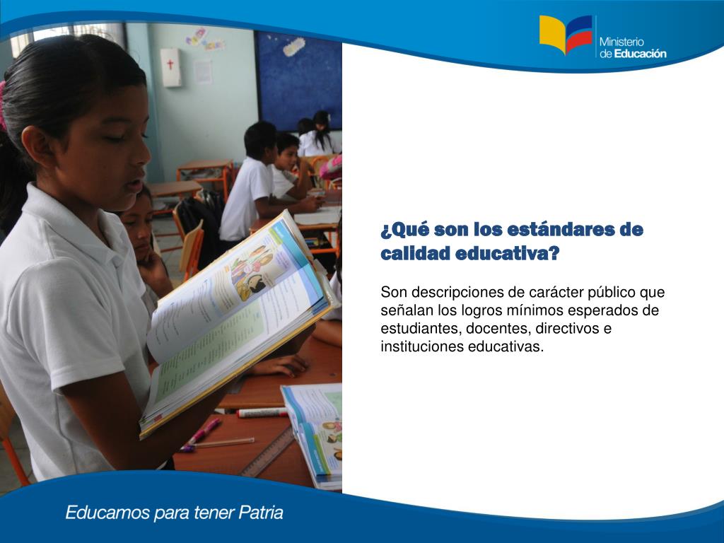 ¿Qué son los estándares de calidad educativa? Son descripciones de carácter público que señalan los logros mínimos esperados de estudiantes, docentes, directivos e instituciones educativas.