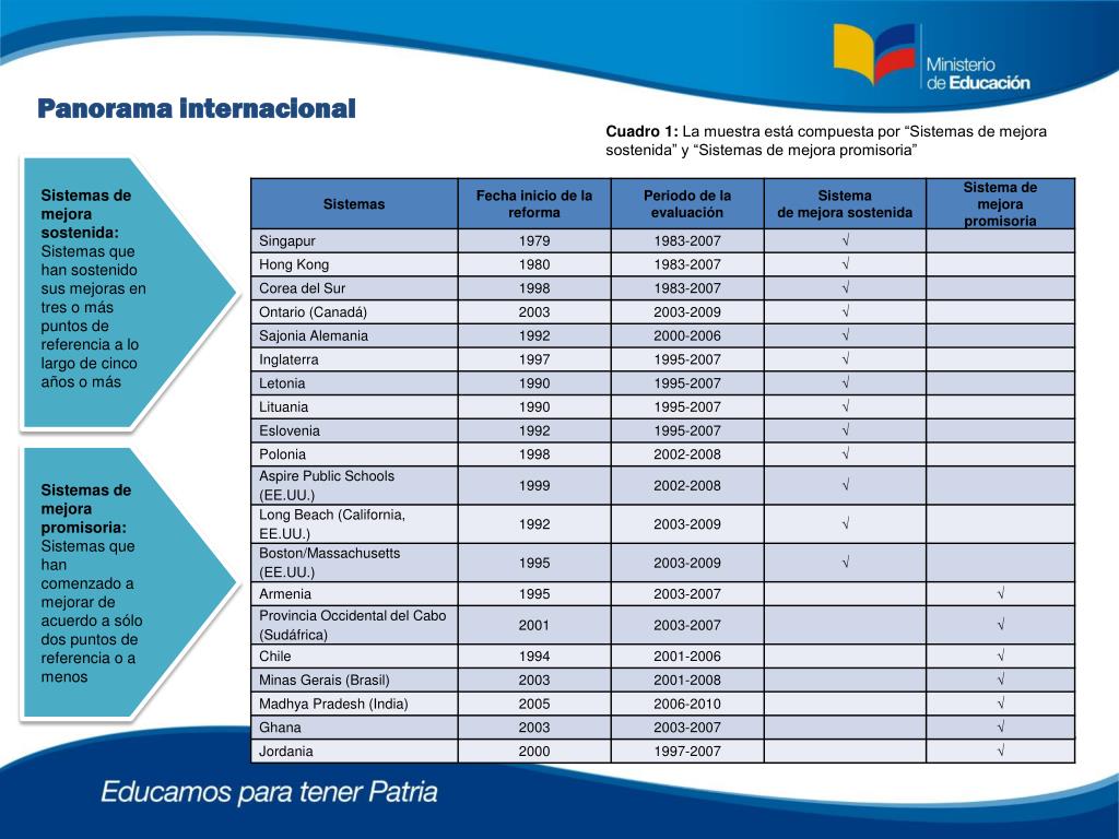Panorama internacional Cuadro 1: La muestra está compuesta por “Sistemas de mejora sostenida” y “Sistemas de mejora promisoria” Sistemas de mejora sostenida: Sistemas que han sostenido sus mejoras en tres o más puntos de referencia a lo largo de cinco años o más Sistemas de mejora promisoria: Sistemas que han comenzado a mejorar de acuerdo a sólo dos puntos de referencia o a menos Mona Mourshed, Chinezi Chijioke y Michael Barber (2010)“How the world’s most improved school systems keep getting better” McKinsey & Company