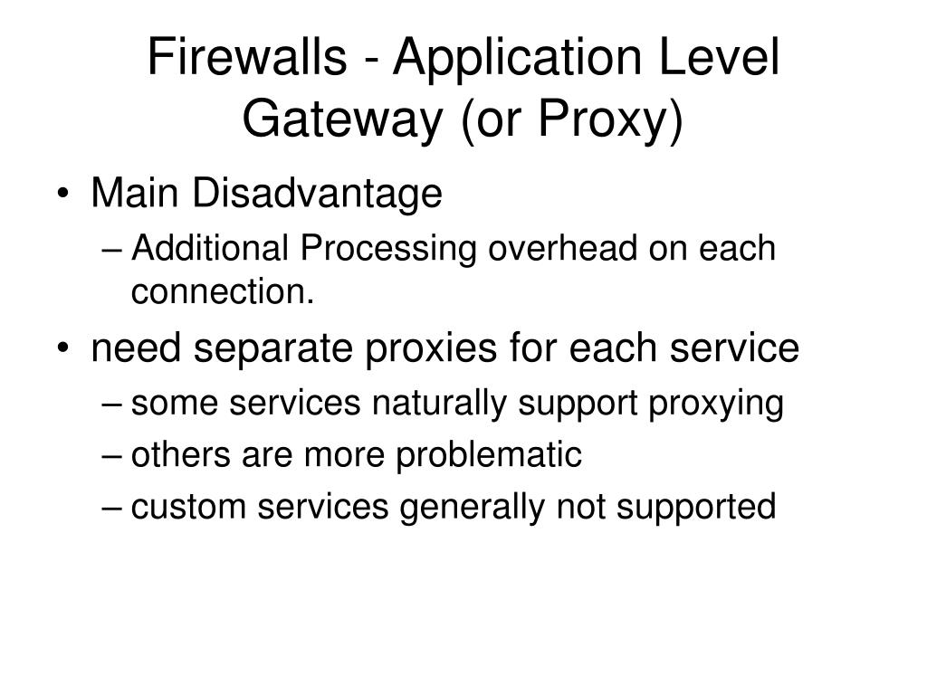 Firewalls - Application Level Gateway (or Proxy) • Main Disadvantage • Additional Processing overhead on each connection. • need separate proxies for each service • some services naturally support proxying • others are more problematic • custom services generally not supported