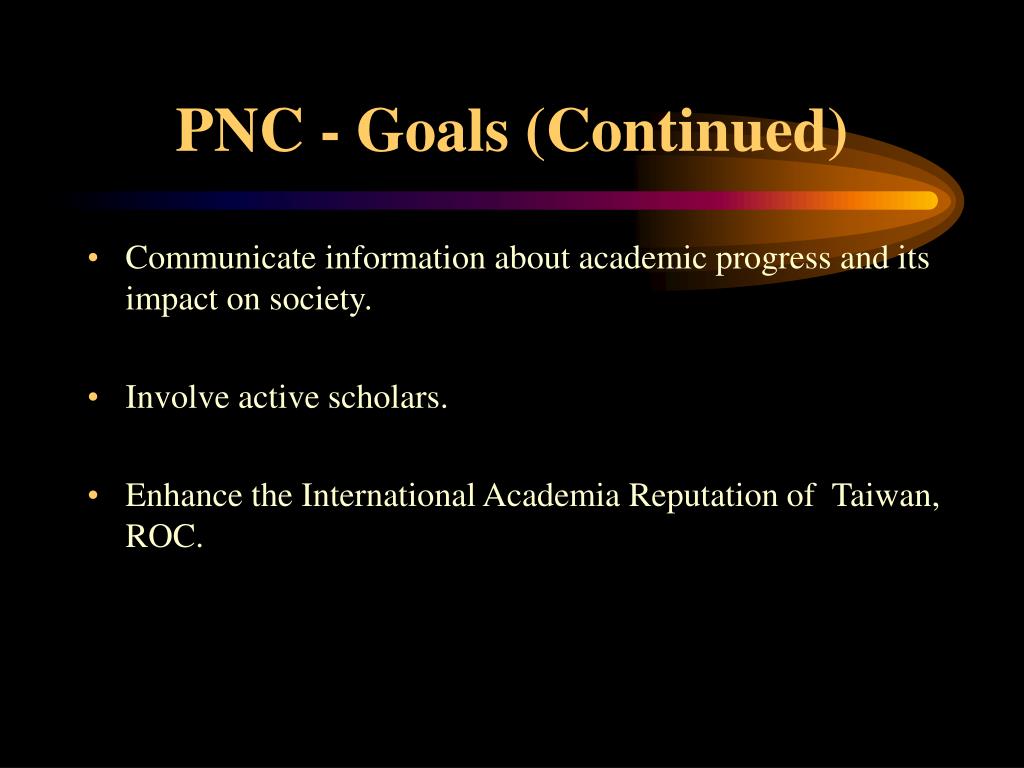 PNC - Goals (Continued) • Communicate information about academic progress and its impact on society. • Involve active scholars. • Enhance the International Academia Reputation of Taiwan, ROC.