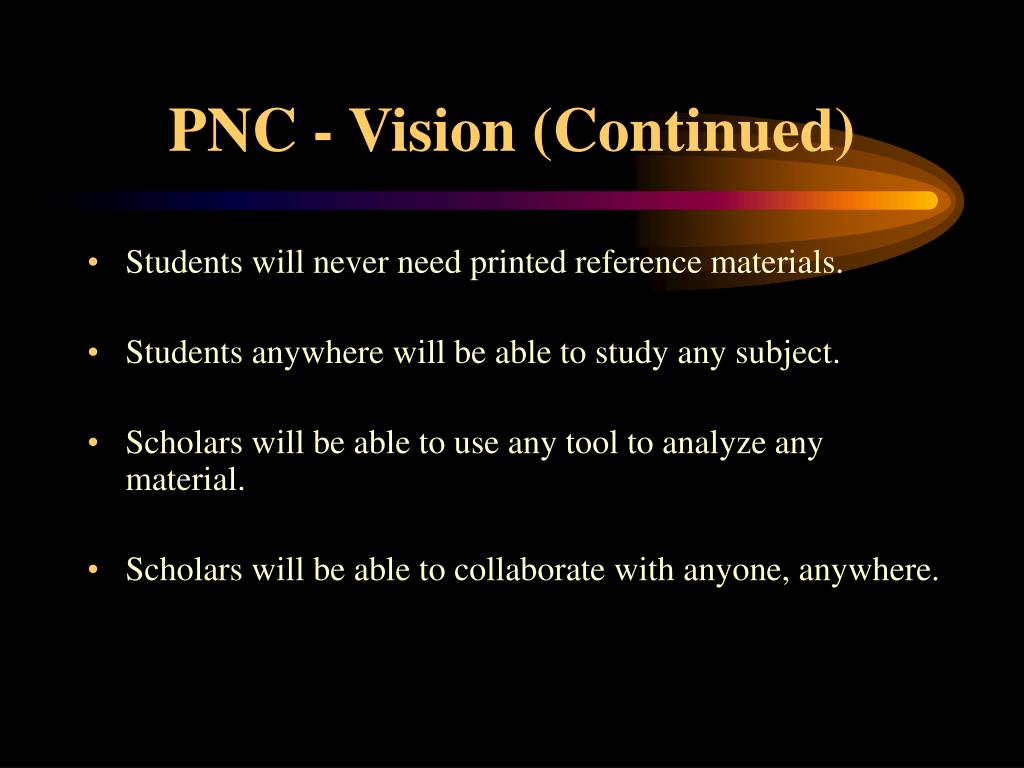 PNC - Vision (Continued) • Students will never need printed reference materials. • Students anywhere will be able to study any subject. • Scholars will be able to use any tool to analyze any material. • Scholars will be able to collaborate with anyone, anywhere.