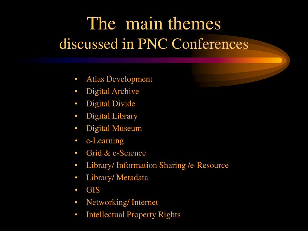 The main themes discussed in PNC Conferences • Atlas Development • Digital Archive • Digital Divide • Digital Library • Digital Museum • e-Learning • Grid & e-Science • Library/ Information Sharing /e-Resource • Library/ Metadata • GIS • Networking/ Internet • Intellectual Property Rights