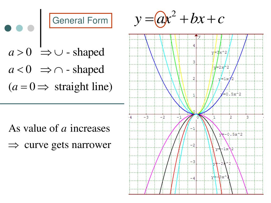Quadratic Curves. A quadratic curve can be expressed in this form:. General Form. General Form. y. x. −1. 0. y. x. 0. 1. General Form. Look at the x-intercept to determine whether shift left or right!. y. x. How to find x-intercepts and y-intercept?. 1 and 4 are the values of the