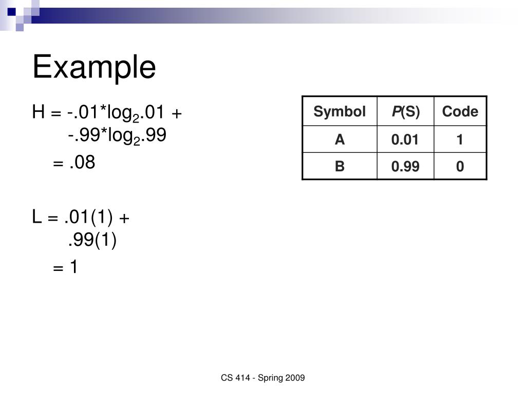 Code Length Relative to Entropy • Huffman reaches entropy limit when all probabilities are negative powers of 2 • i.e., 1/2; 1/4; 1/8; 1/16; etc. • H <= Code Length <= H + 1 CS 414 - Spring 2009