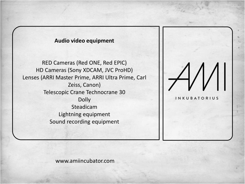 Audio video equipment RED Cameras (Red ONE, Red EPIC) HD Cameras (Sony XDCAM, JVC ProHD) Lenses (ARRI Master Prime, ARRI Ultra Prime, Carl Zeiss, Canon) Telescopic Crane Technocrane 30 Dolly Steadicam Lightning equipment Sound recording equipment www.amiincubator.com
