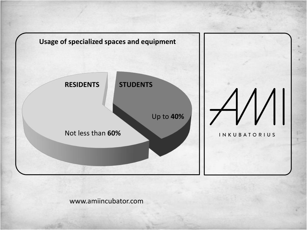 Usage of specialized spaces and equipment RESIDENTS STUDENTS Up to 40% Not less than 60% www.amiincubator.com