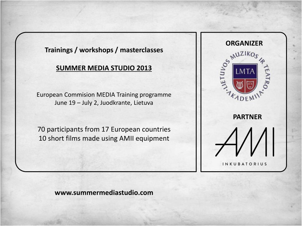 Trainings / workshops / masterclasses SUMMER MEDIA STUDIO 2013 European Commision MEDIA Training programme June 19 – July 2, Juodkrante, Lietuva 70 participants from 17 European countries 10 short films made using AMII equipment www.summermediastudio.com ORGANIZER PARTNER