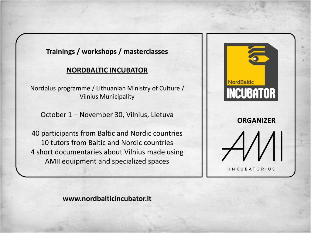 Trainings / workshops / masterclasses NORDBALTIC INCUBATOR Nordplus programme / Lithuanian Ministry of Culture / Vilnius Municipality October 1 – November 30, Vilnius, Lietuva 40 participants from Baltic and Nordic countries 10 tutors from Baltic and Nordic countries 4 short documentaries about Vilnius made using AMII equipment and specialized spaces www.nordbalticincubator.lt ORGANIZER