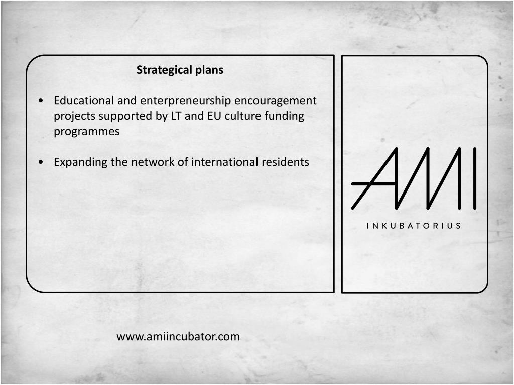 Strategical plans • Educational and enterpreneurship encouragement projects supported by LT and EU culture funding programmes • Expanding the network of international residents www.amiincubator.com