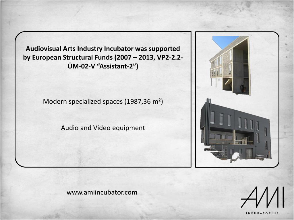Audiovisual Arts Industry Incubator was supported by European Structural Funds (2007 – 2013, VP2-2.2-ŪM-02-V “Assistant-2”) Modern specialized spaces (1987,36 m2) Audio and Video equipment www.amiincubator.com