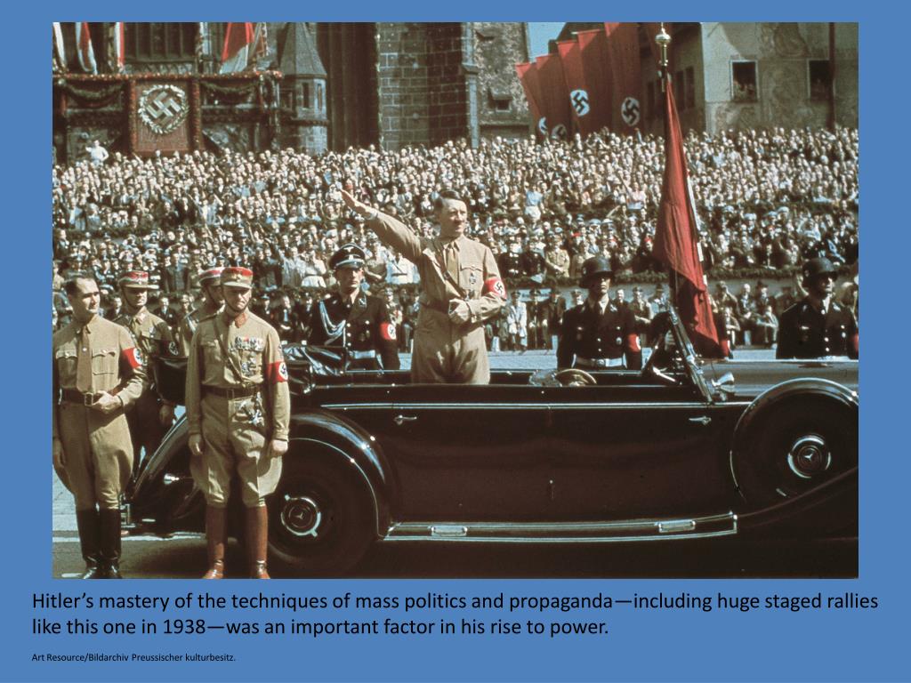Hitler’s mastery of the techniques of mass politics and propaganda—including huge staged rallies like this one in 1938—was an important factor in his rise to power. Art Resource/Bildarchiv Preussischer kulturbesitz.
