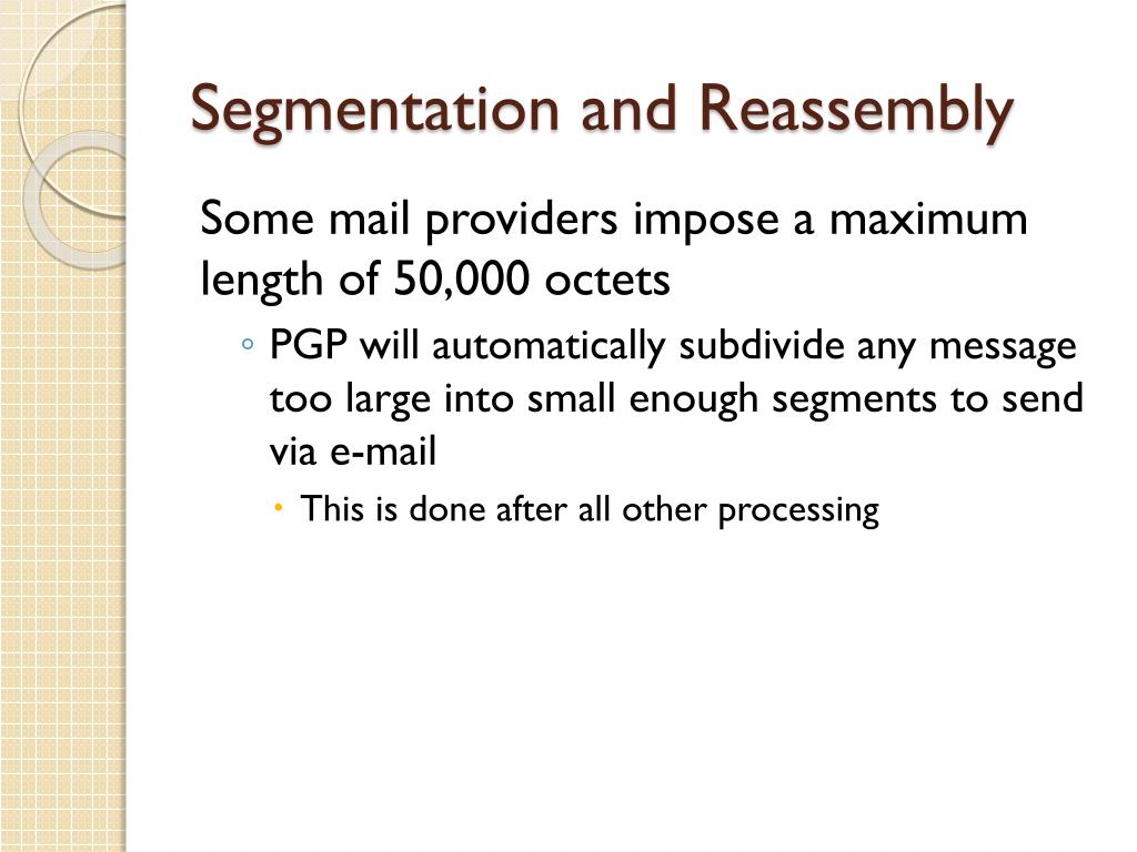 Segmentation and Reassembly Some mail providers impose a maximum length of 50,000 octets • PGP will automatically subdivide any message too large into small enough segments to send via e-mail • This is done after all other processing