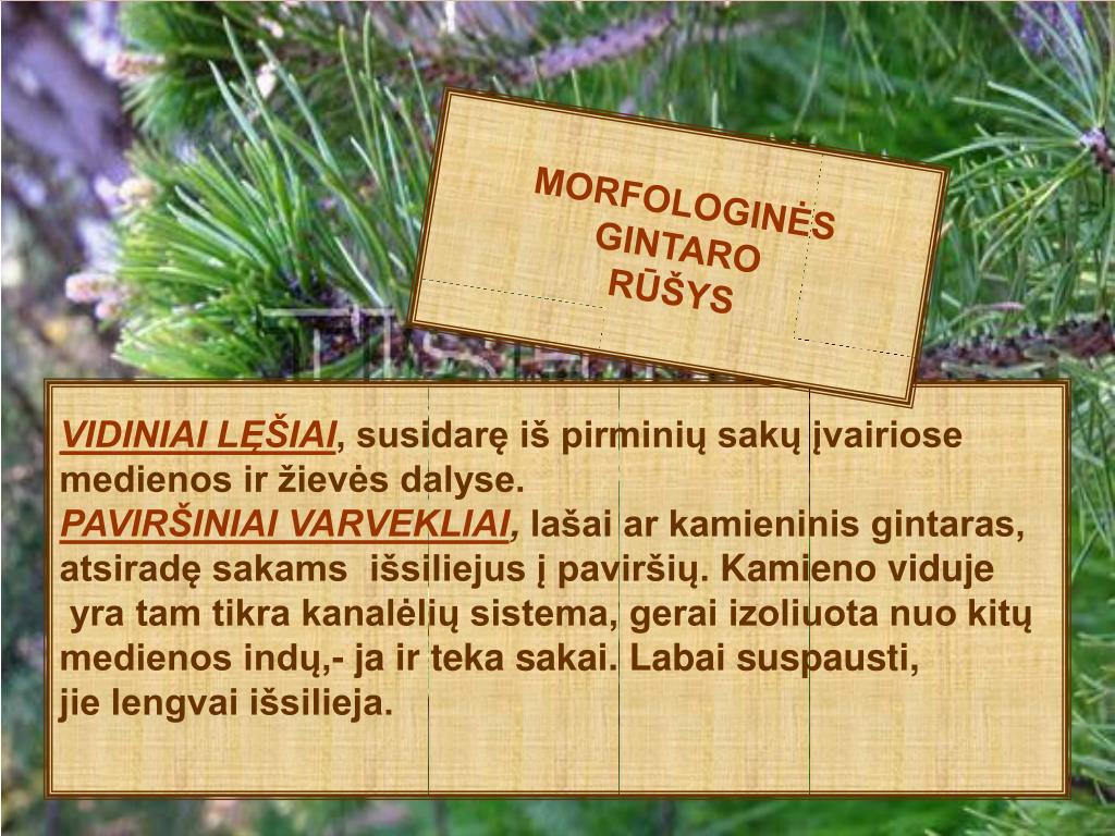 SAKAI KAMIENE • Medieniniai lęšiai; • Požieviniai lęšiai; • Žievinis gintaras; • 4) Gintaro varvekliai; • 5) Gintaro lašai; • 6) Kamieninis gintaras.
