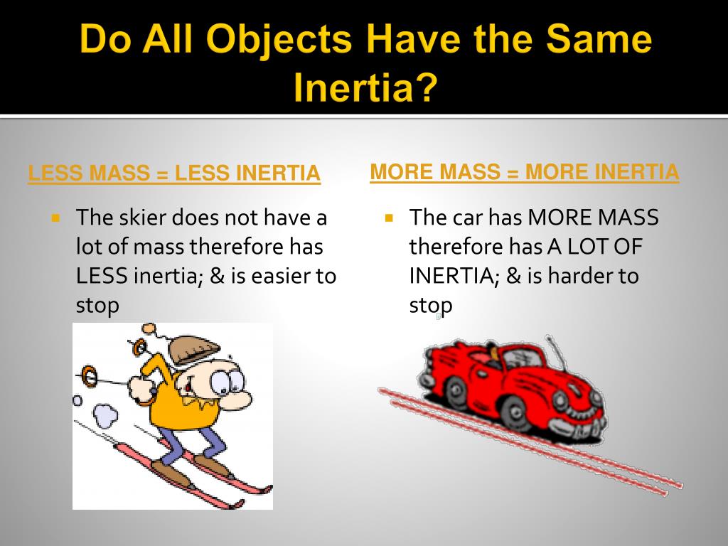 Do All Objects Have the Same Inertia? Less Mass = Less Inertia More Mass = More Inertia The car has MORE MASS therefore has A LOT OF INERTIA; & is harder to stop • The skier does not have a lot of mass therefore has LESS inertia; & is easier to stop