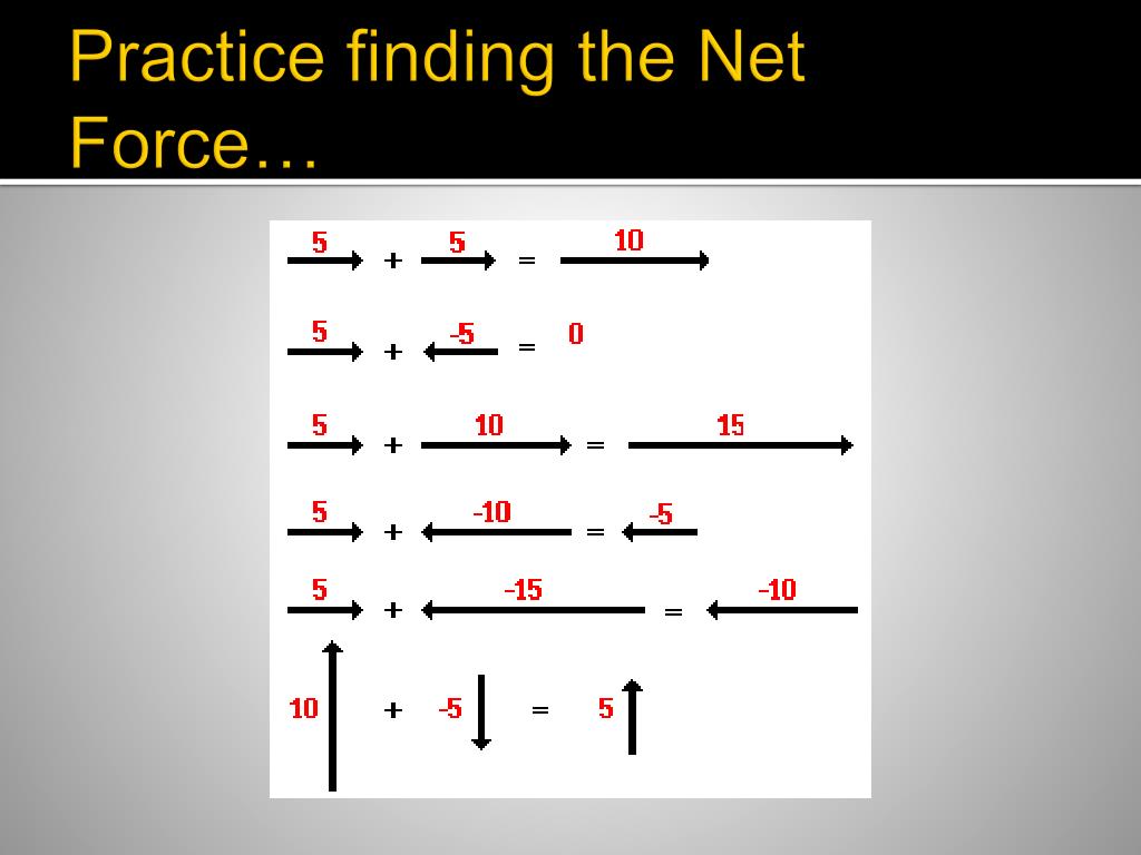 Unbalanced Forces • Forces that don’t cancel & the object moves in the direction of the stronger force. • DIFFERENT directions, SUBTRACT the forces • SAME direction, ADD the forces.